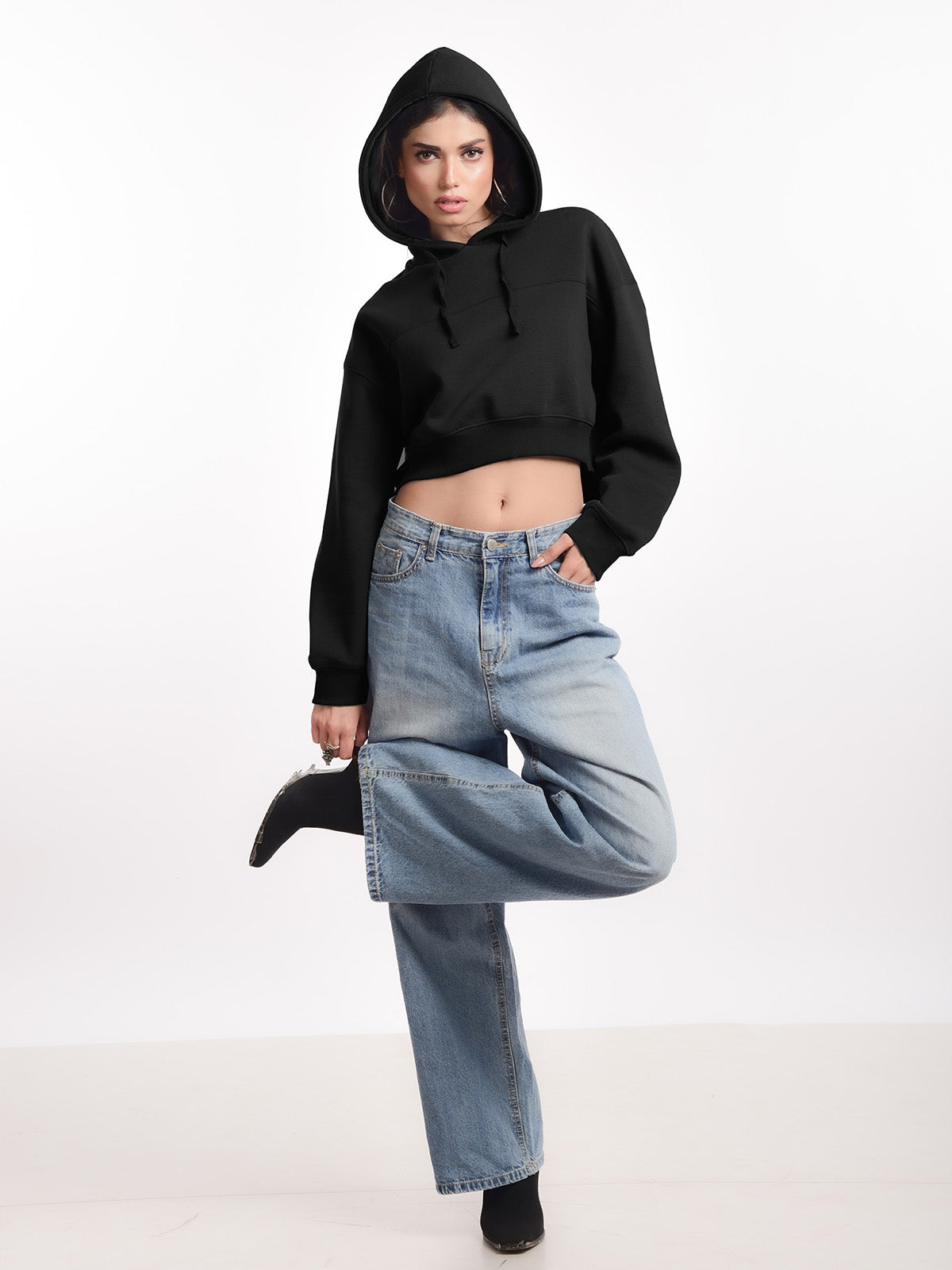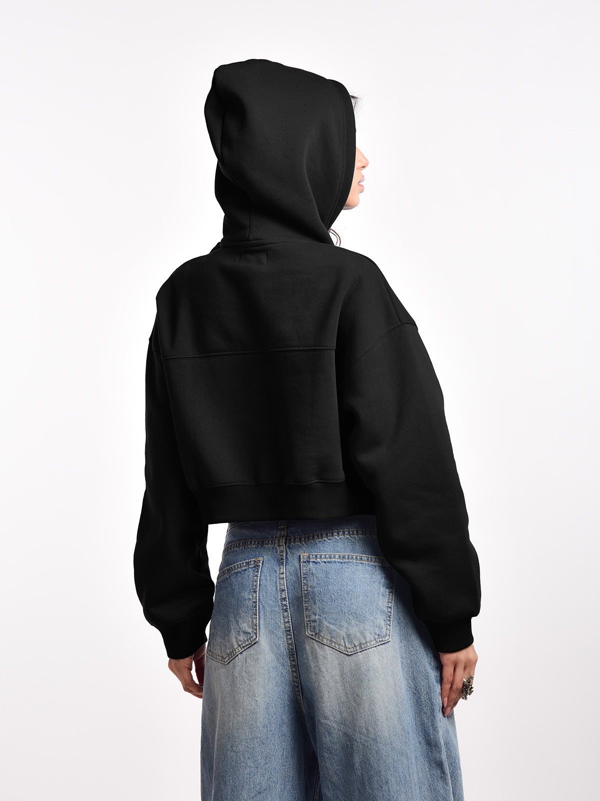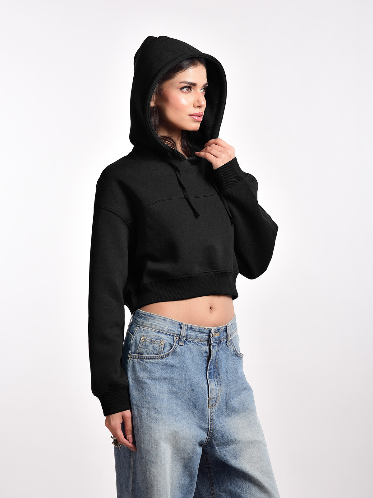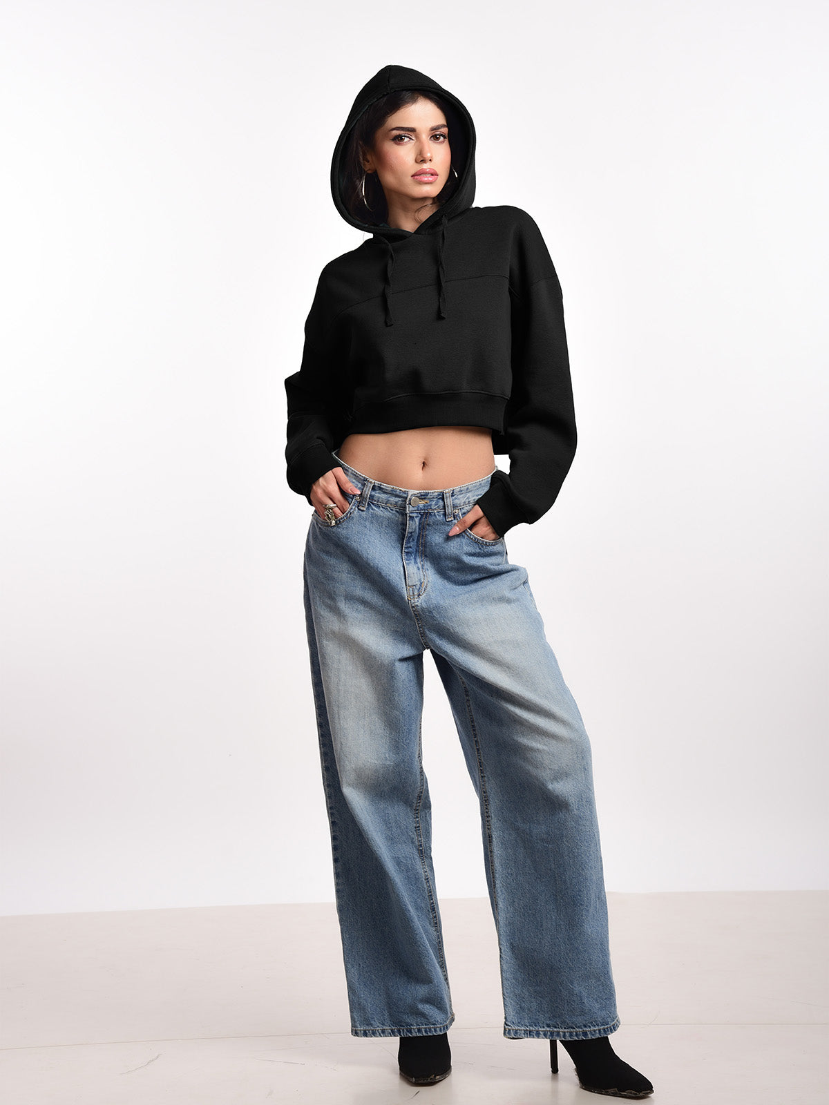 Femmora 100% Cotton Fleece Long Sleeve Solid Crop Length Hoodie Sweatshirt for Women | Casual Loose Fit Knitted Pullover | Dropped Shoulder – Winter Wear – Black ( Pack of 1)