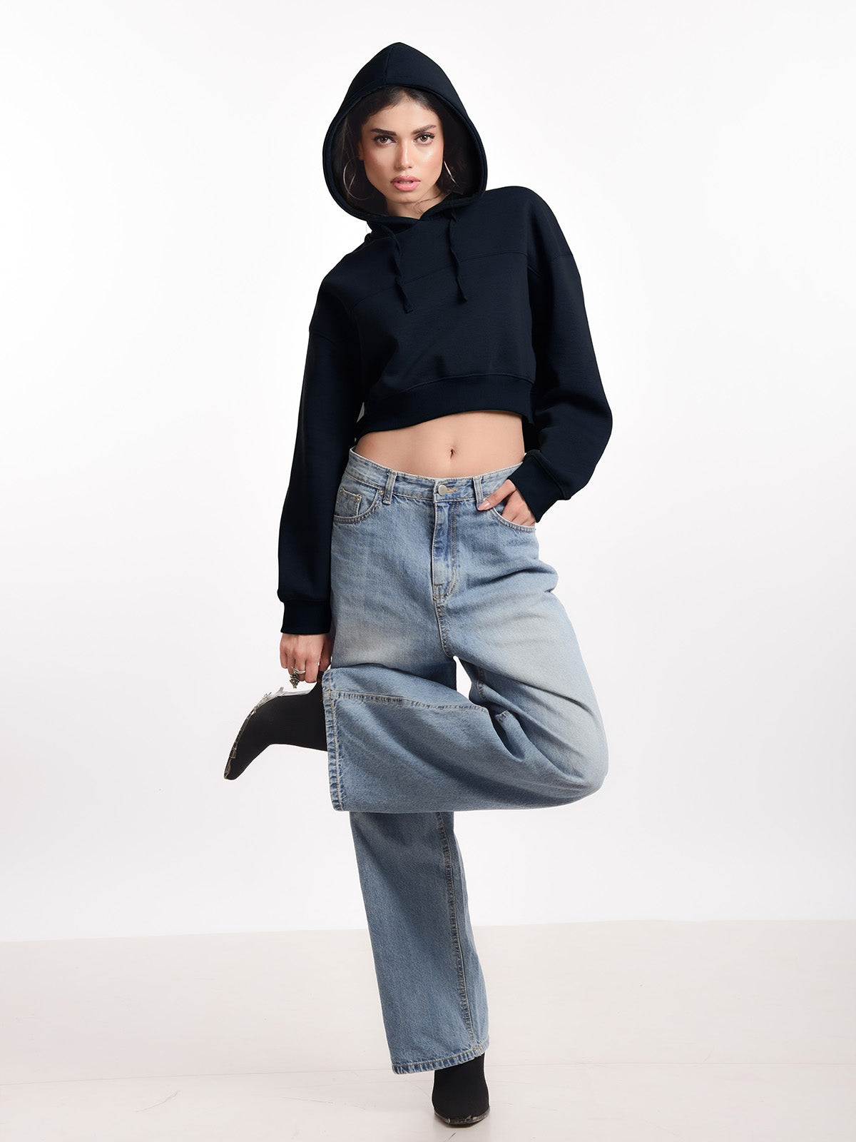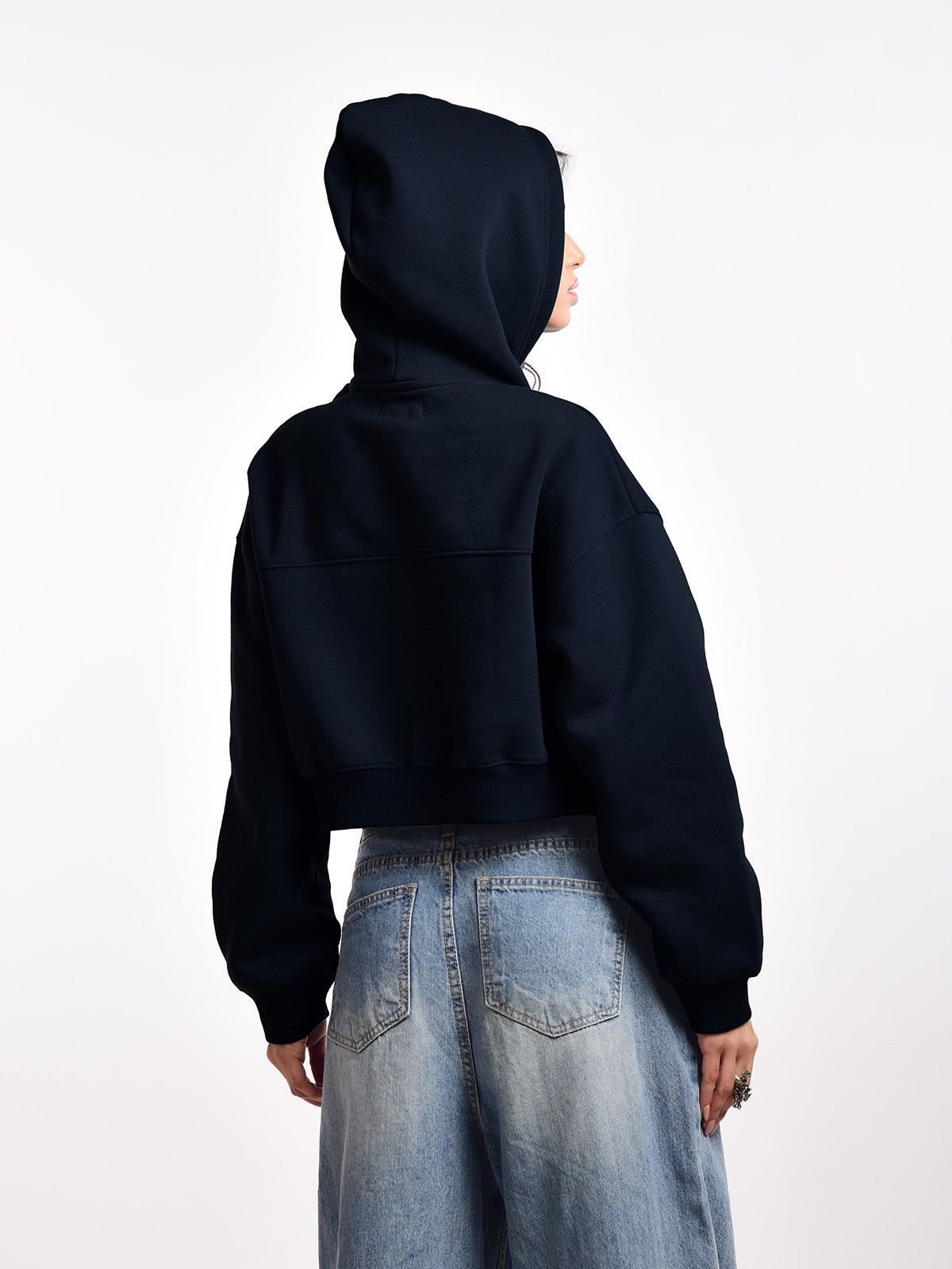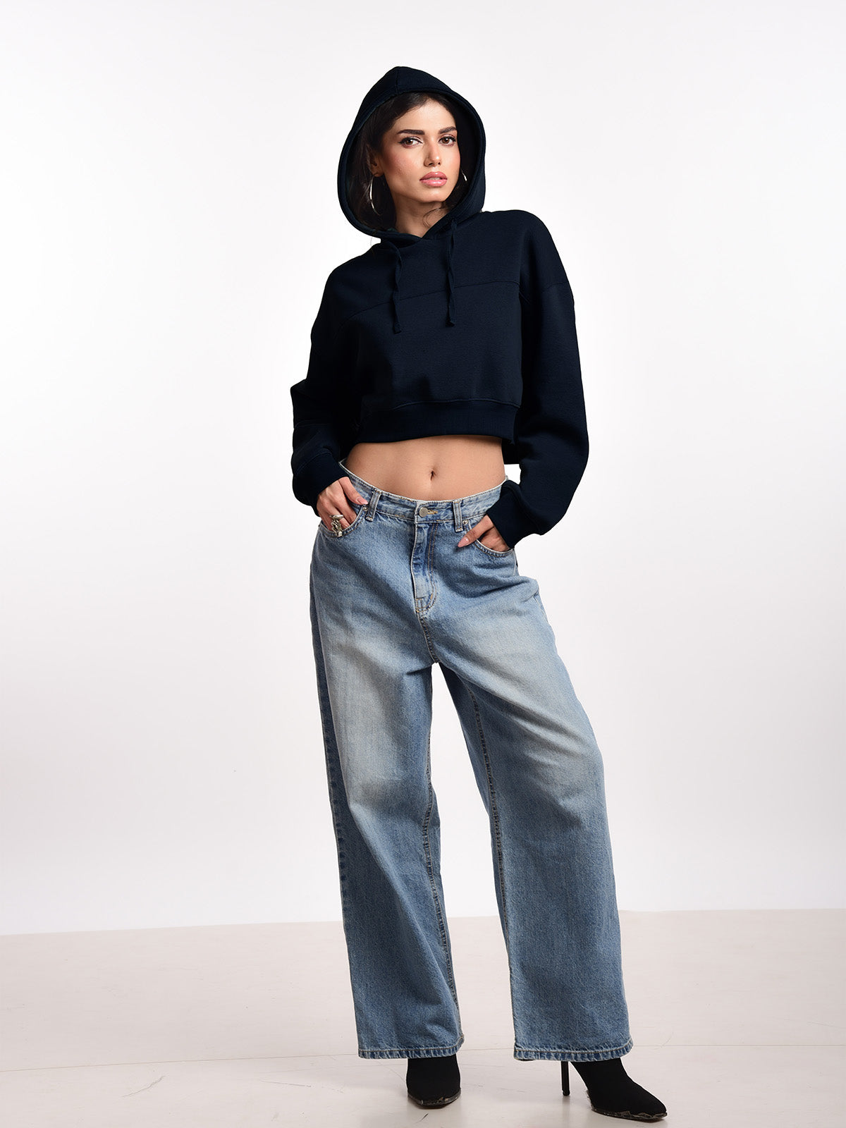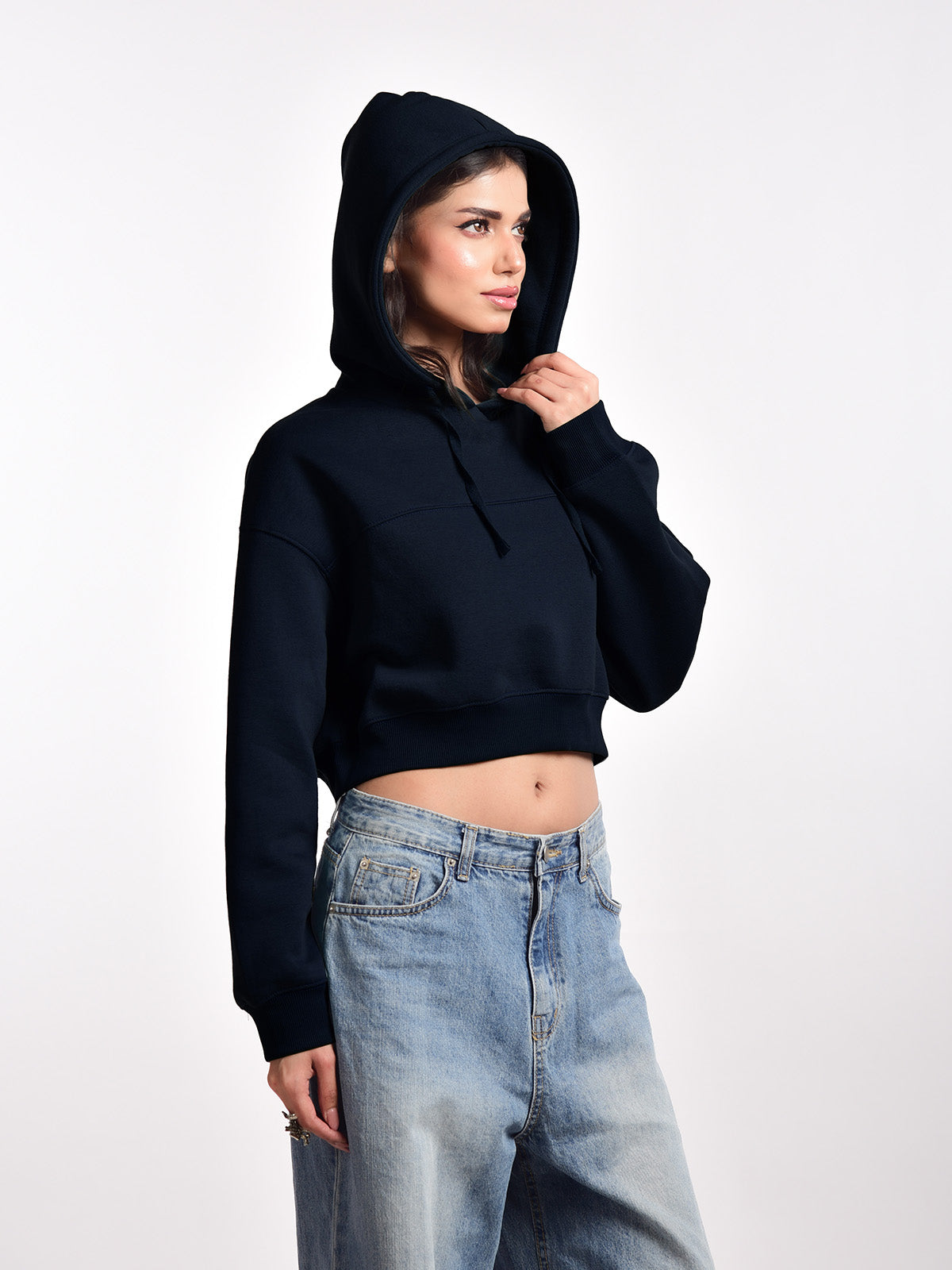 Femmora 100% Cotton Fleece Long Sleeve Solid Crop Length Hoodie Sweatshirt for Women | Casual Loose Fit Knitted Pullover | Dropped Shoulder – Winter Wear – Navy ( Pack of 1)