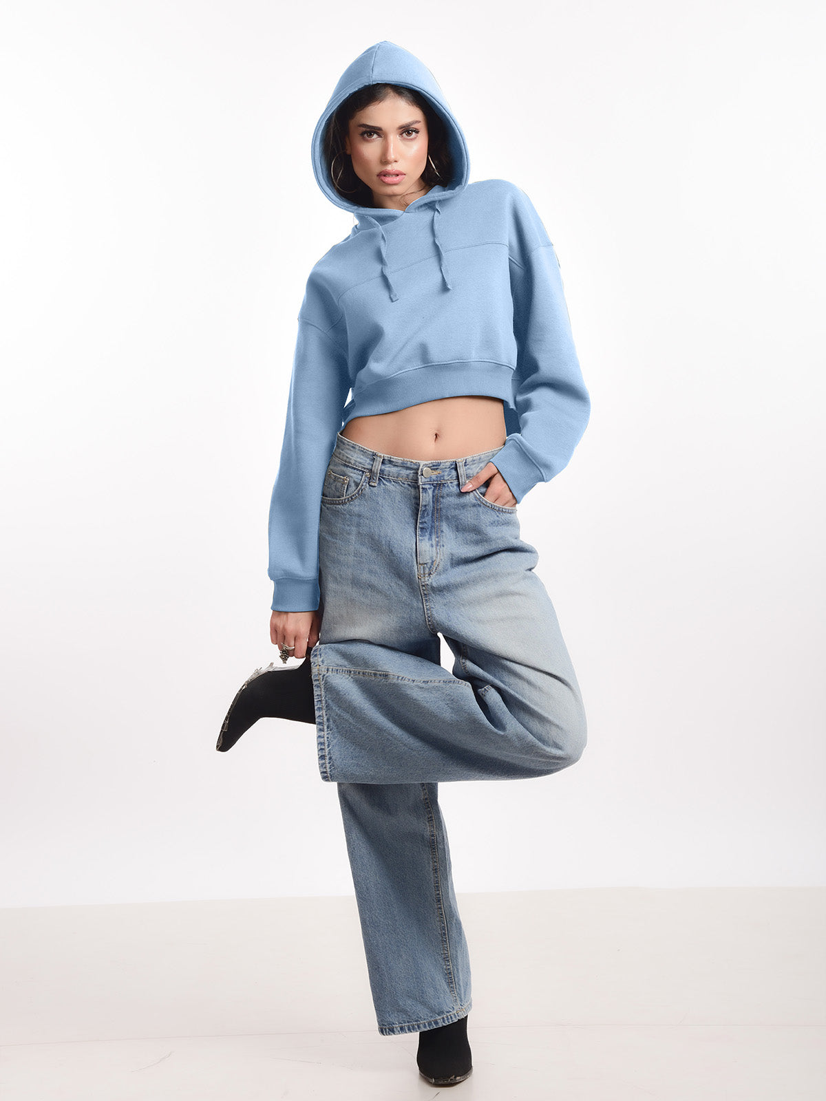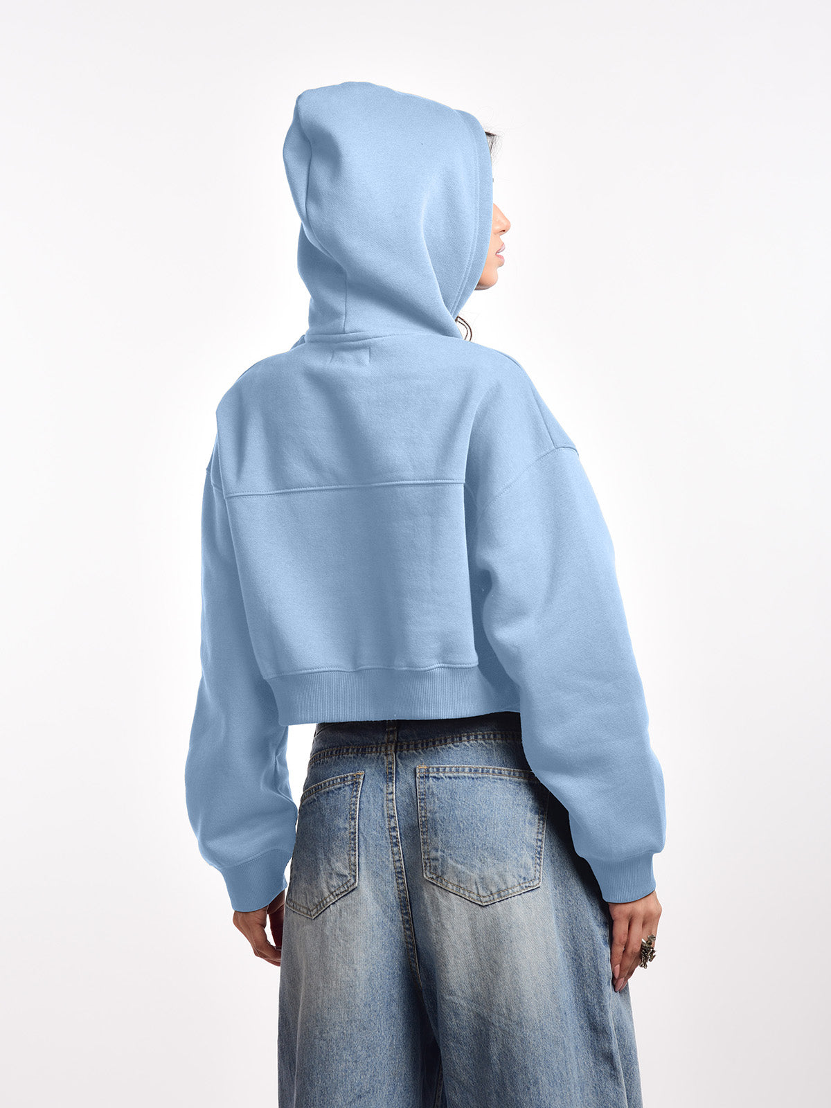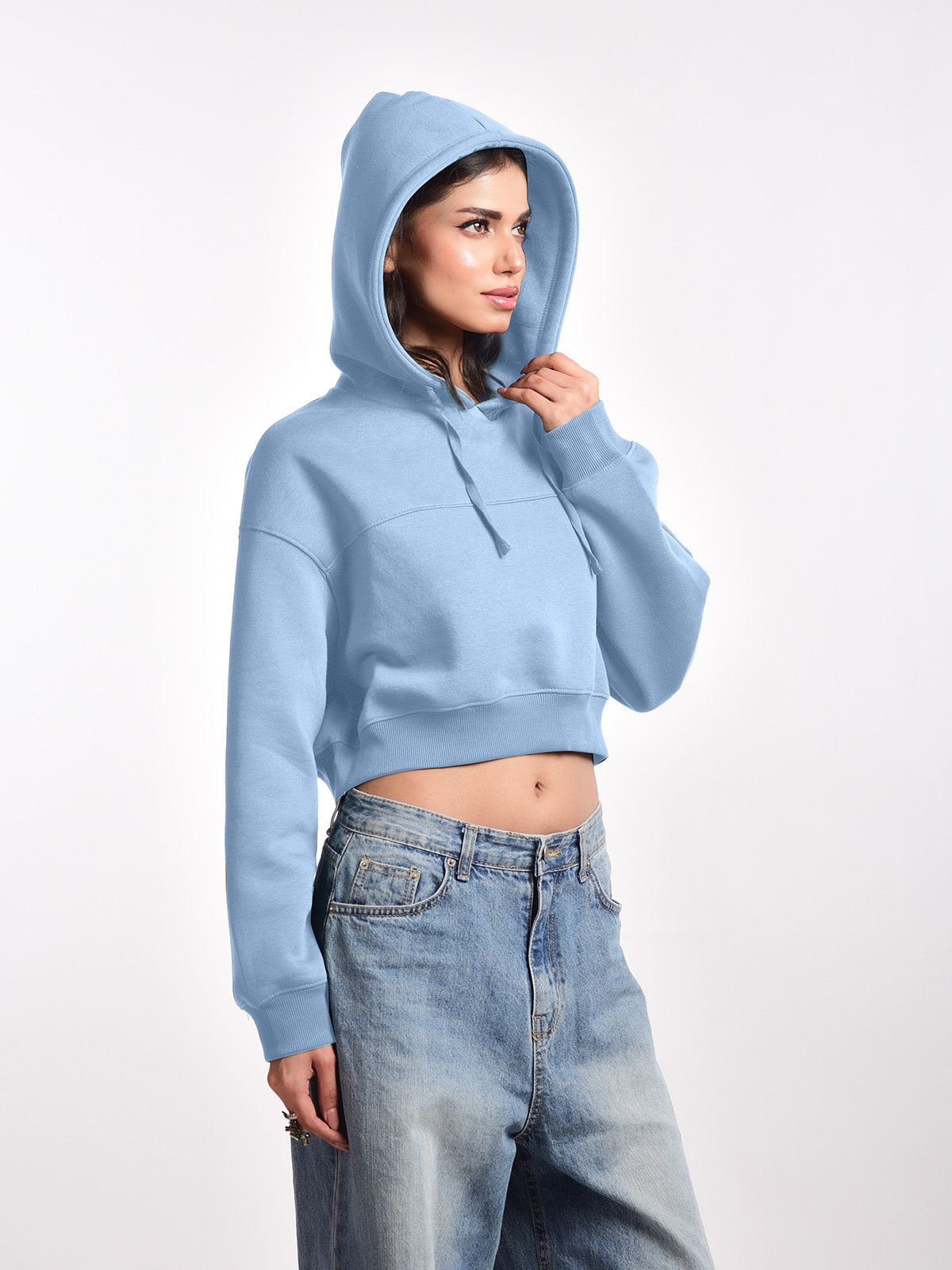 Femmora 100% Cotton Fleece Long Sleeve Solid Crop Length Hoodie Sweatshirt for Women | Casual Loose Fit Knitted Pullover | Dropped Shoulder – Winter Wear – Pastel Blue ( Pack of 1)