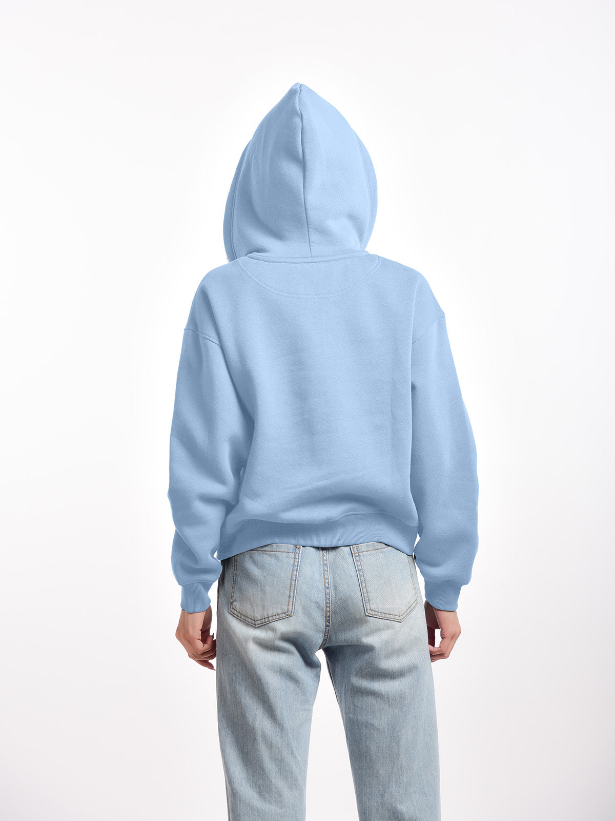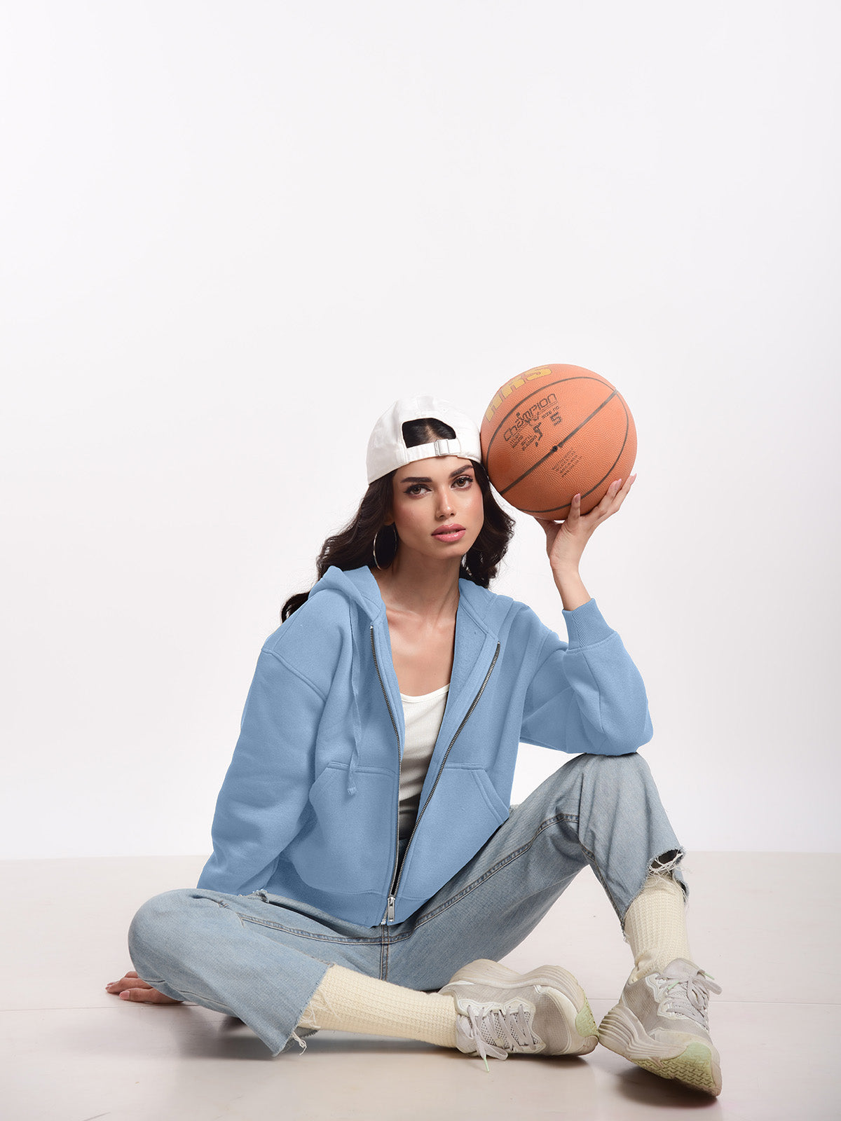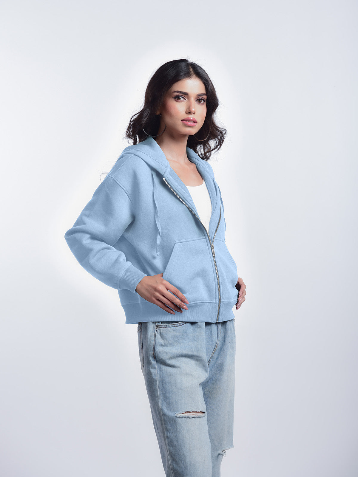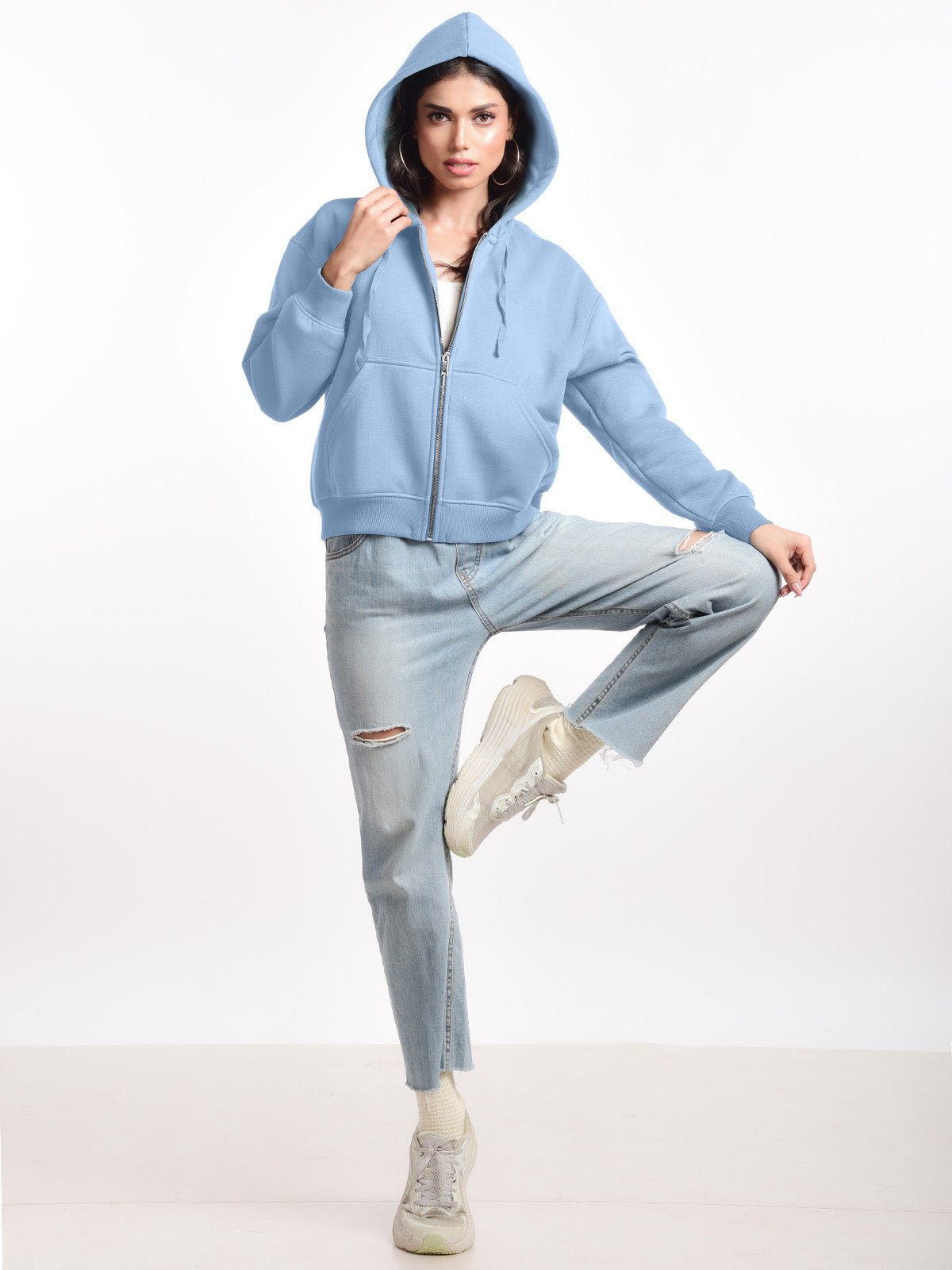 Femmora Premium 100% Cotton Fleece Long Sleeve Oversized Zipped Hoodie for Women | Loose Fit| Knitted fabric | Kangaroo Pocket and Dropped Shoulder – Pastel Blue (Pack of 1)