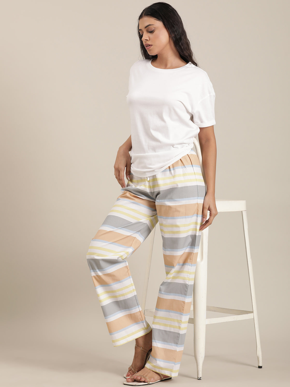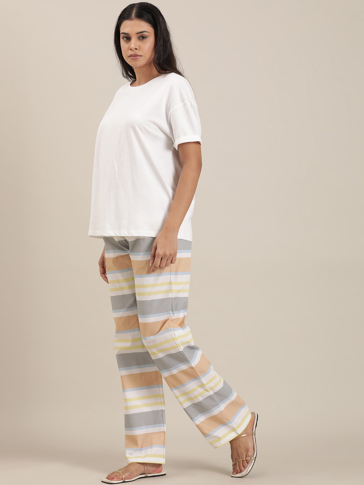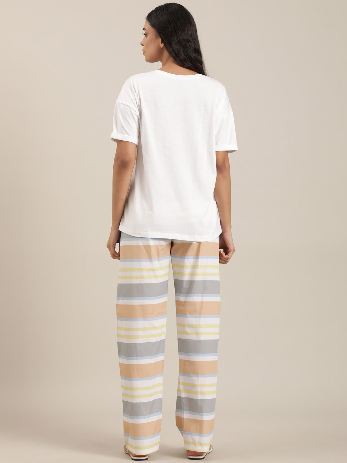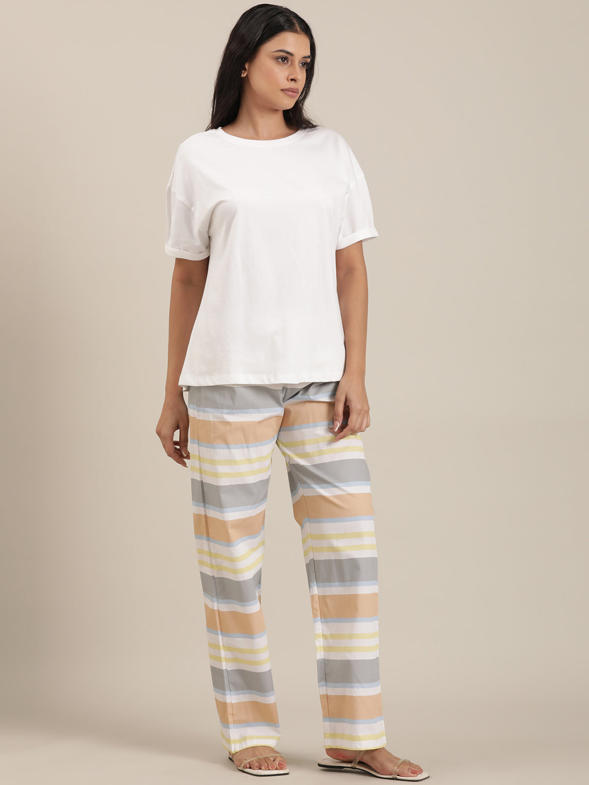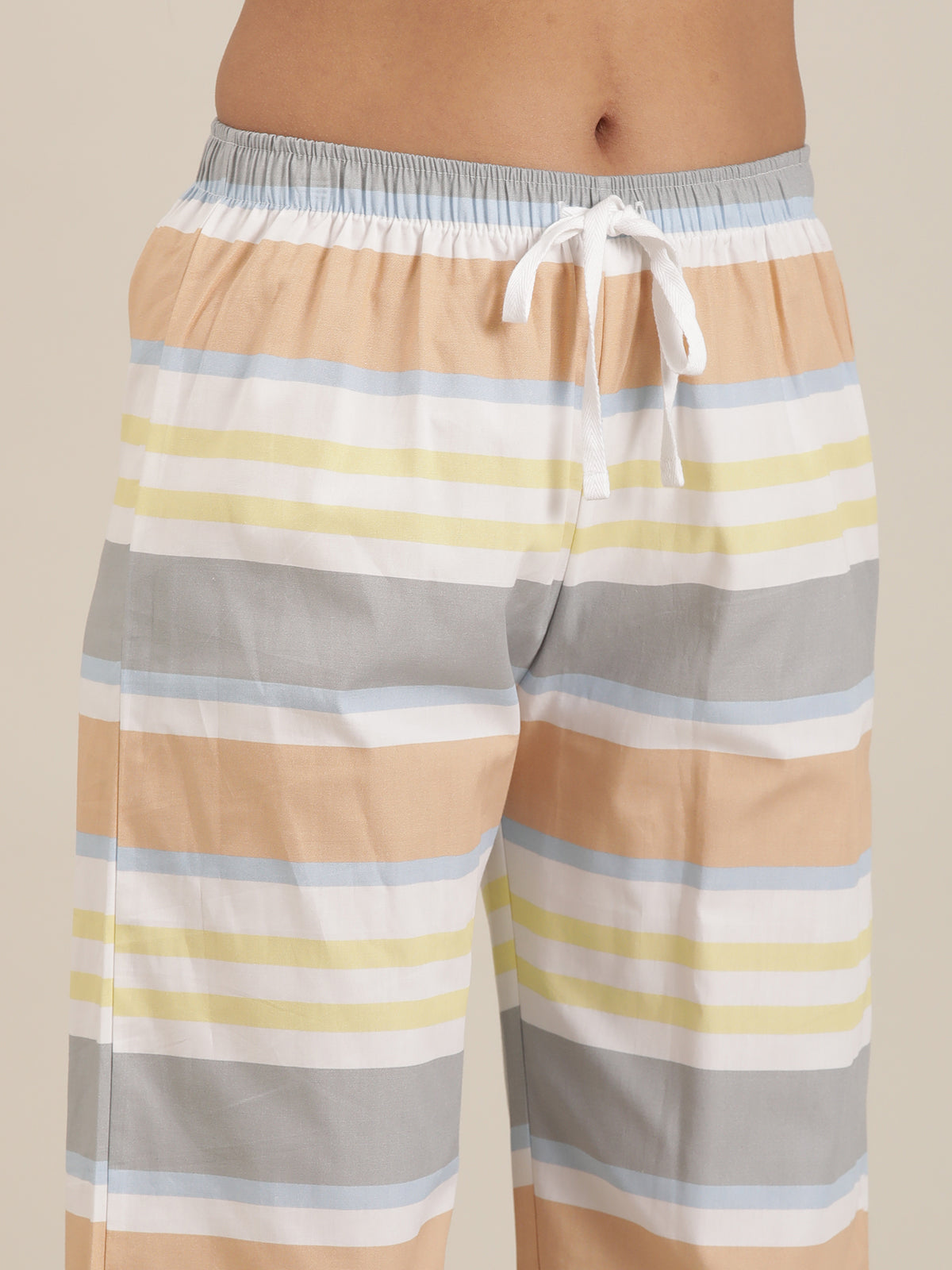Femmora Women’s Cotton Night Set | 2-Piece Lounge Outfit with Relaxed Fit Top & Striped Drawstring Pyjamas | Comfortable Sleepwear & Loungewear | Mix Colour |Set of 1