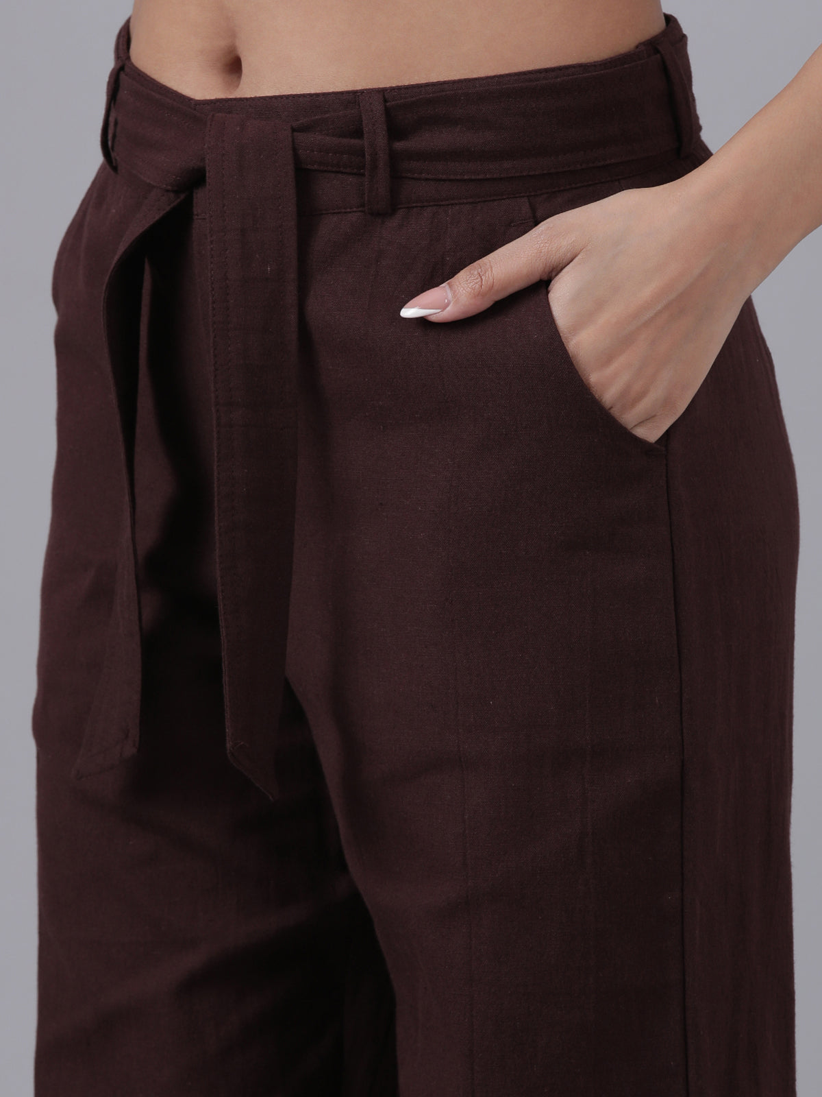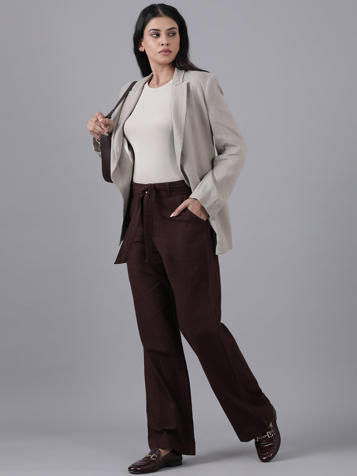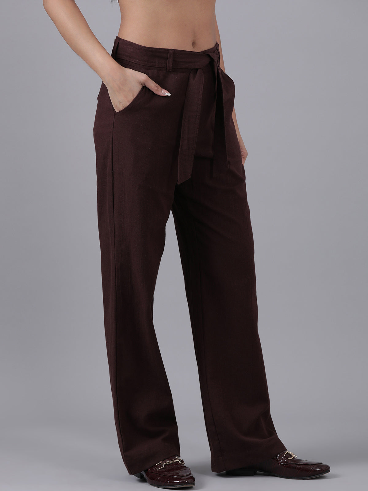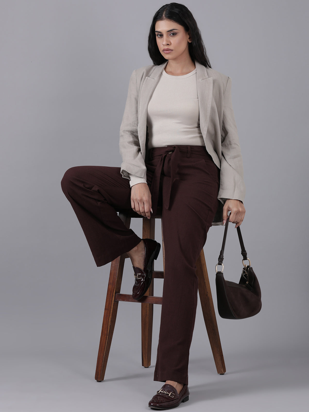 Femmora Women’s High-Waist Cotton Linen Straight Fit Trousers with Elastic Waistband & Button Closure | Formal Office Wear Pants with 2 Slant Pockets | Breathable Workwear Bottoms |Chocolate| Pack of 1