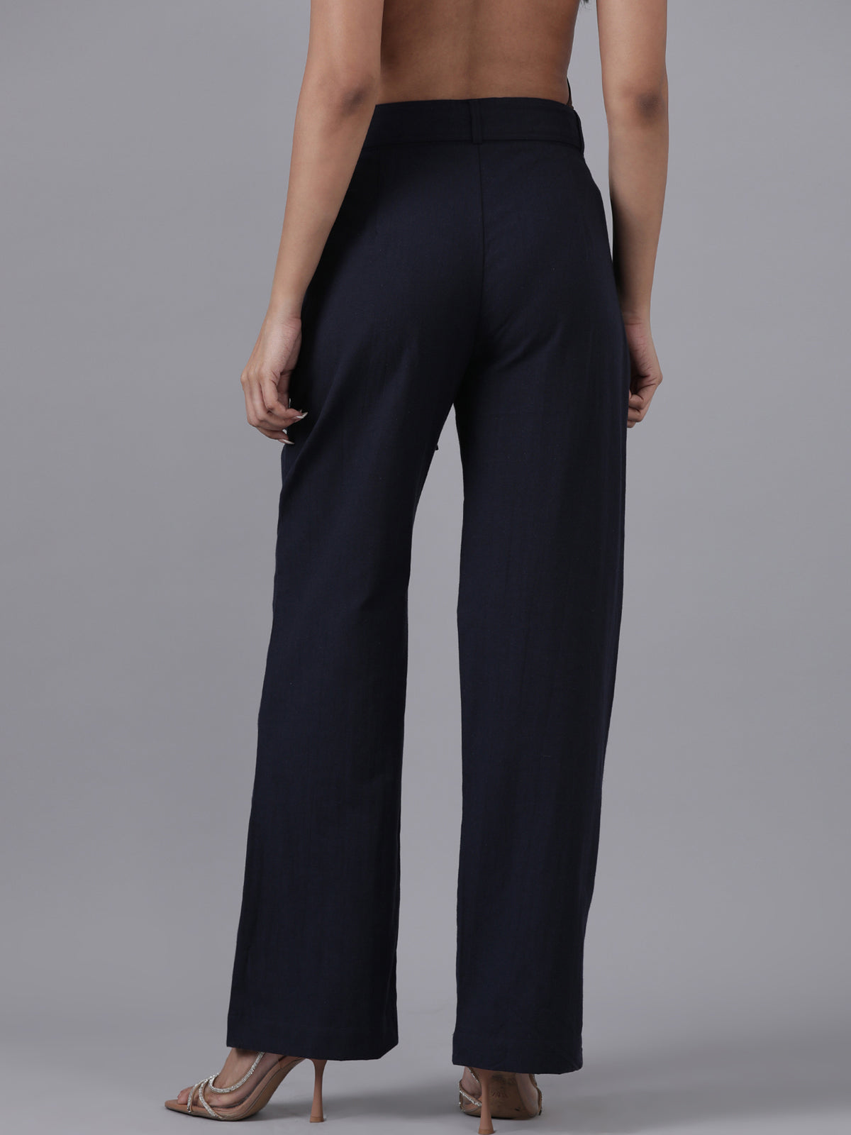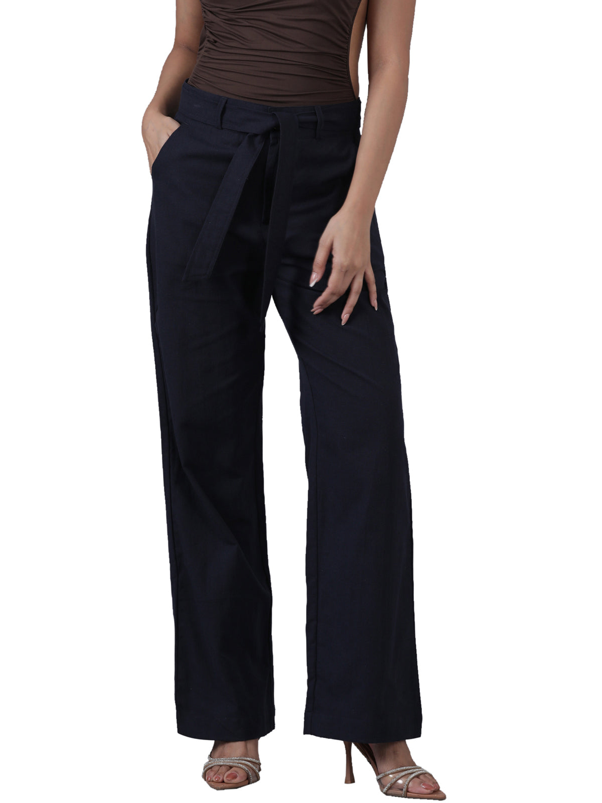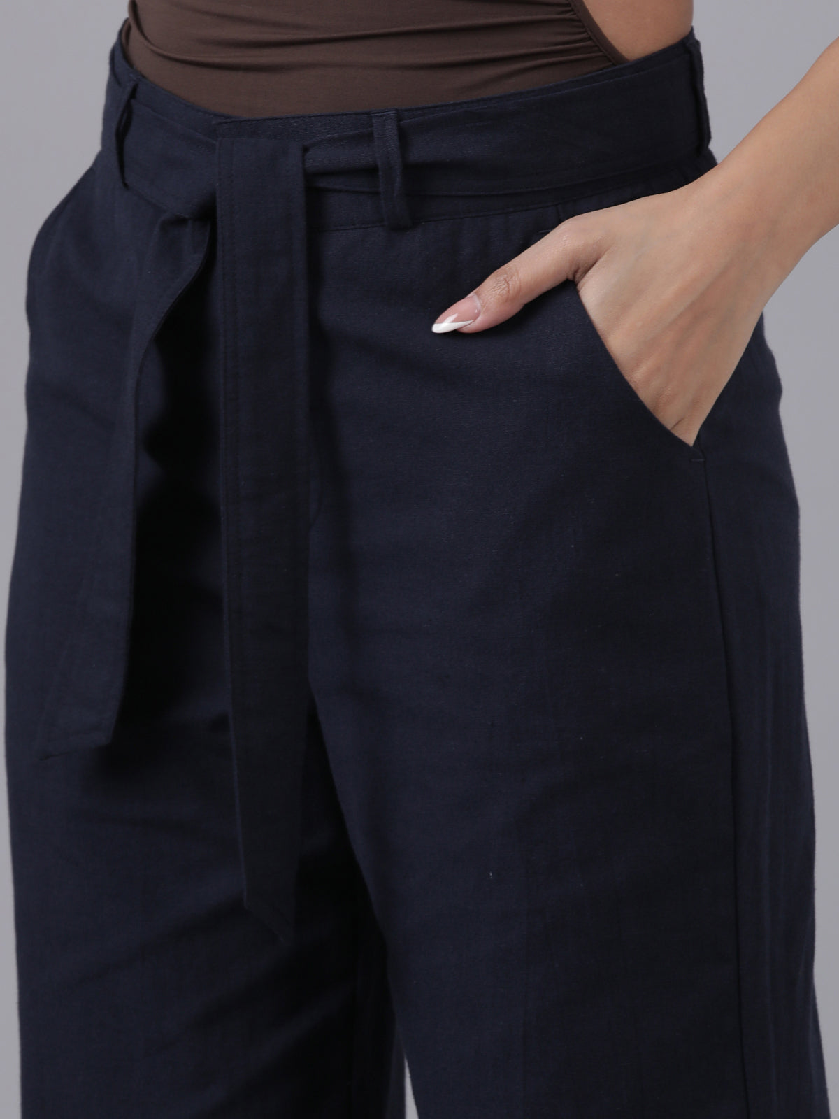 Femmora Women’s High-Waist Cotton Linen Straight Fit Trousers with Elastic Waistband & Button Closure | Formal Office Wear Pants with 2 Slant Pockets | Breathable Workwear Bottoms |Navy| Pack of 1