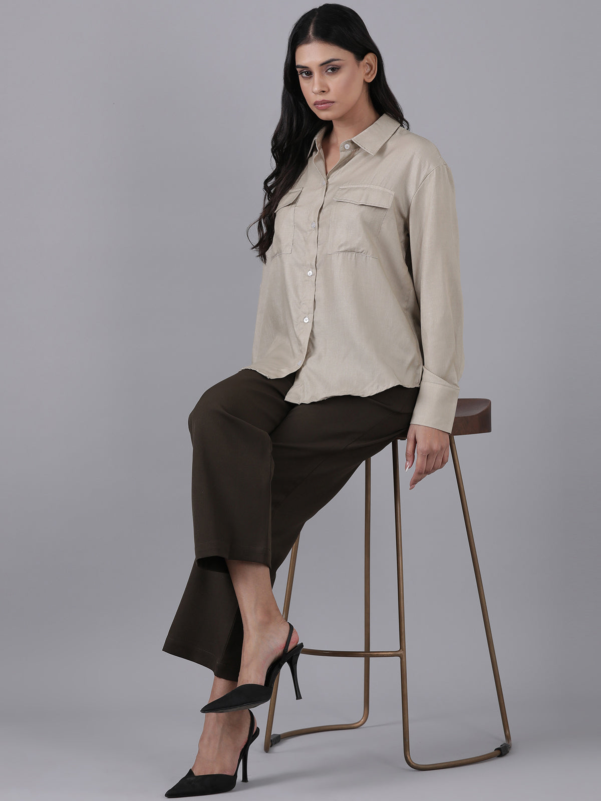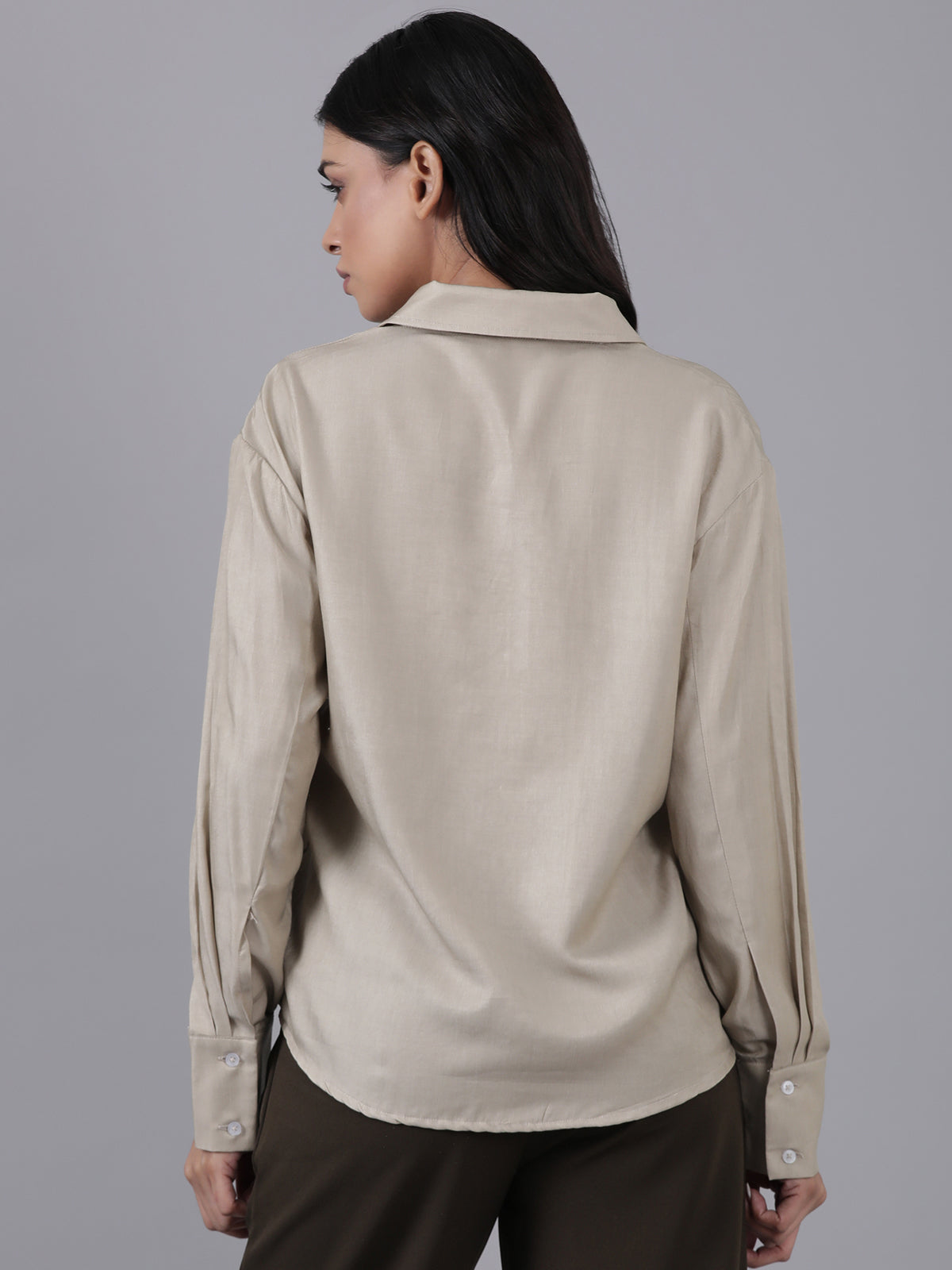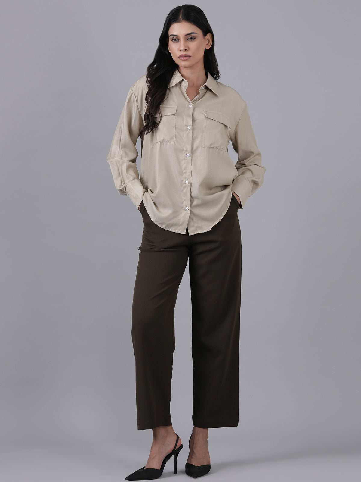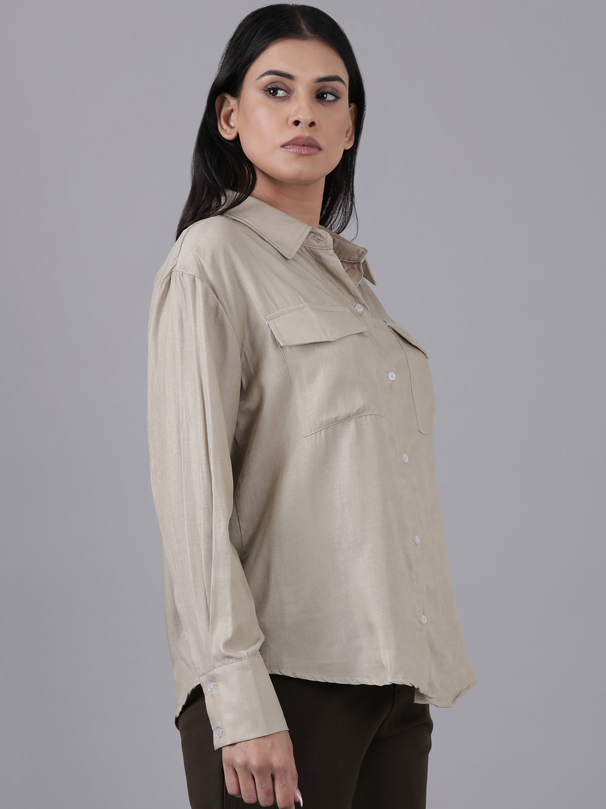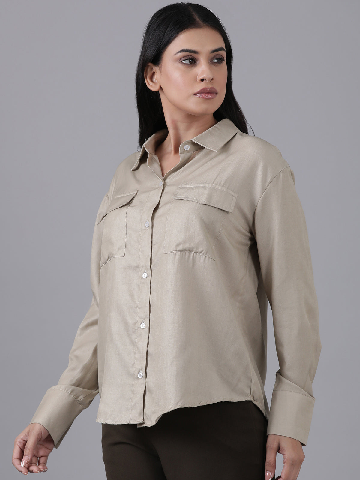 Femmora Women’s Cargo Shirt in Soft Bsy Satin-Viscose Blend | Regular Fit Full Sleeve Shirt with Flap Pockets & Rounded Hem | Stylish Casual & Office Wear | Moca Brown |Pack of 1