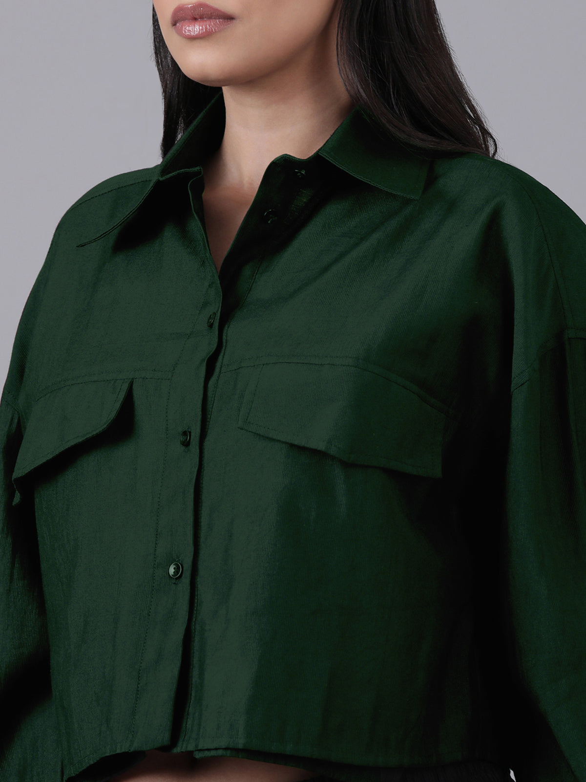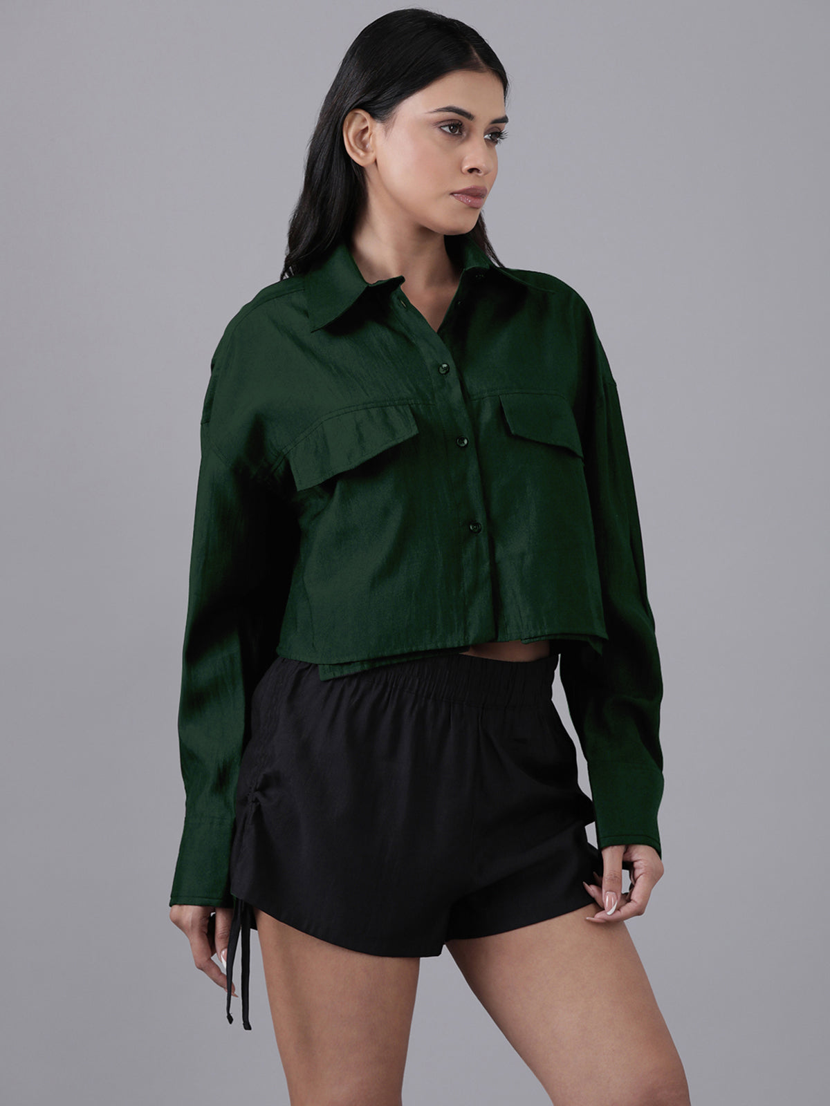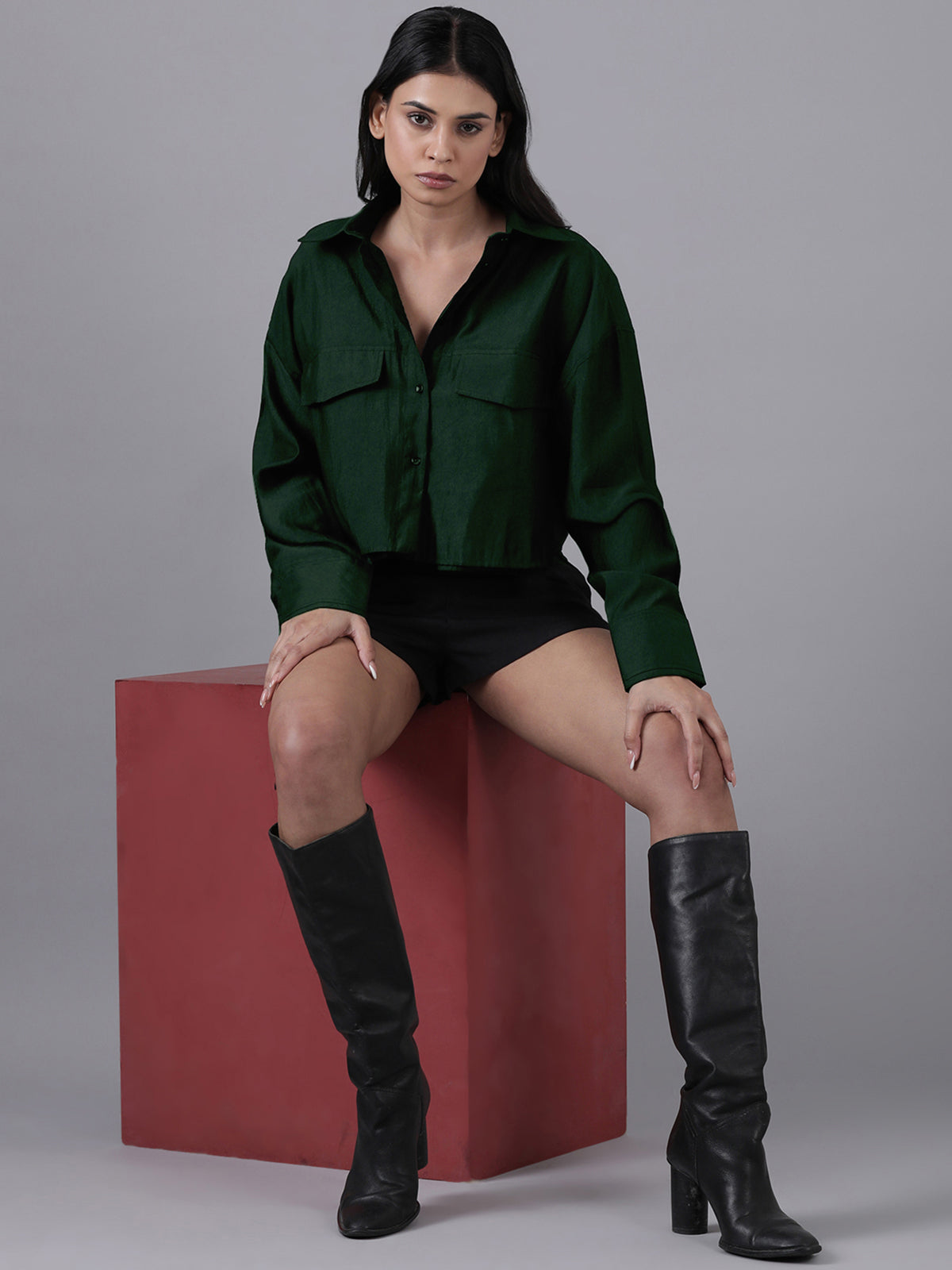 Femmora Women’s Solid Crop Shirt in Soft Viscose-Polyester Blend | Full Sleeve with 2 Flap Pocket Shirt with Turn-Down Collar | Stylish Casual & Office Wear | Olive |Pack of 1