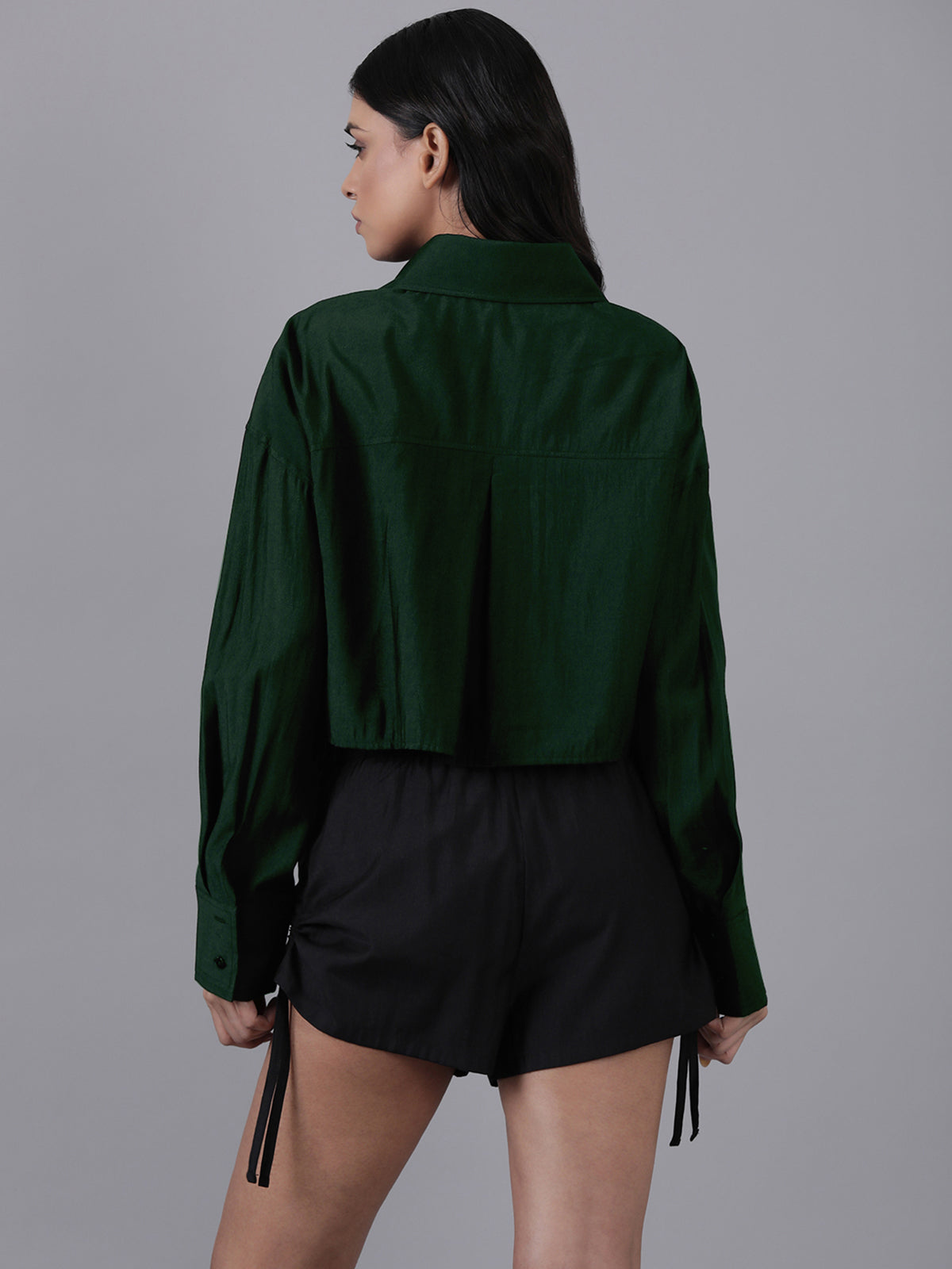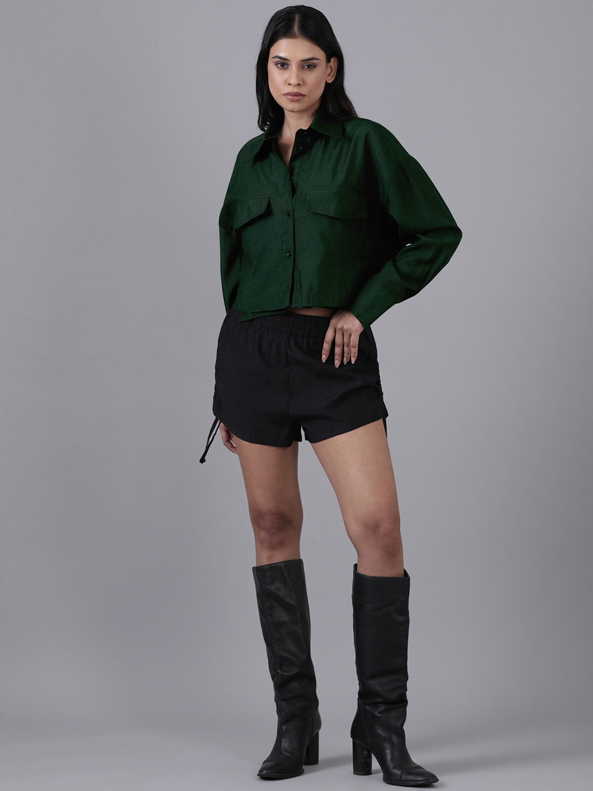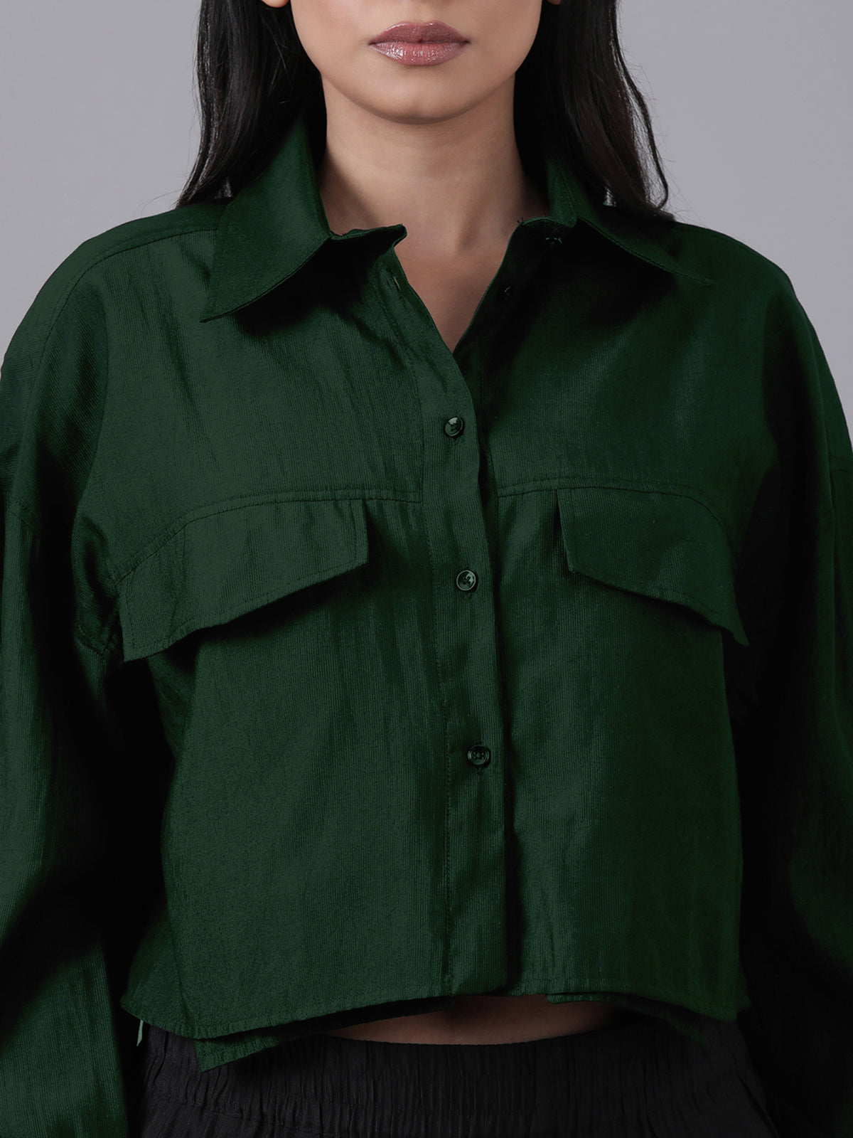 Femmora Women’s Solid Crop Shirt in Soft Viscose-Polyester Blend | Full Sleeve with 2 Flap Pocket Shirt with Turn-Down Collar | Stylish Casual & Office Wear | Olive |Pack of 1