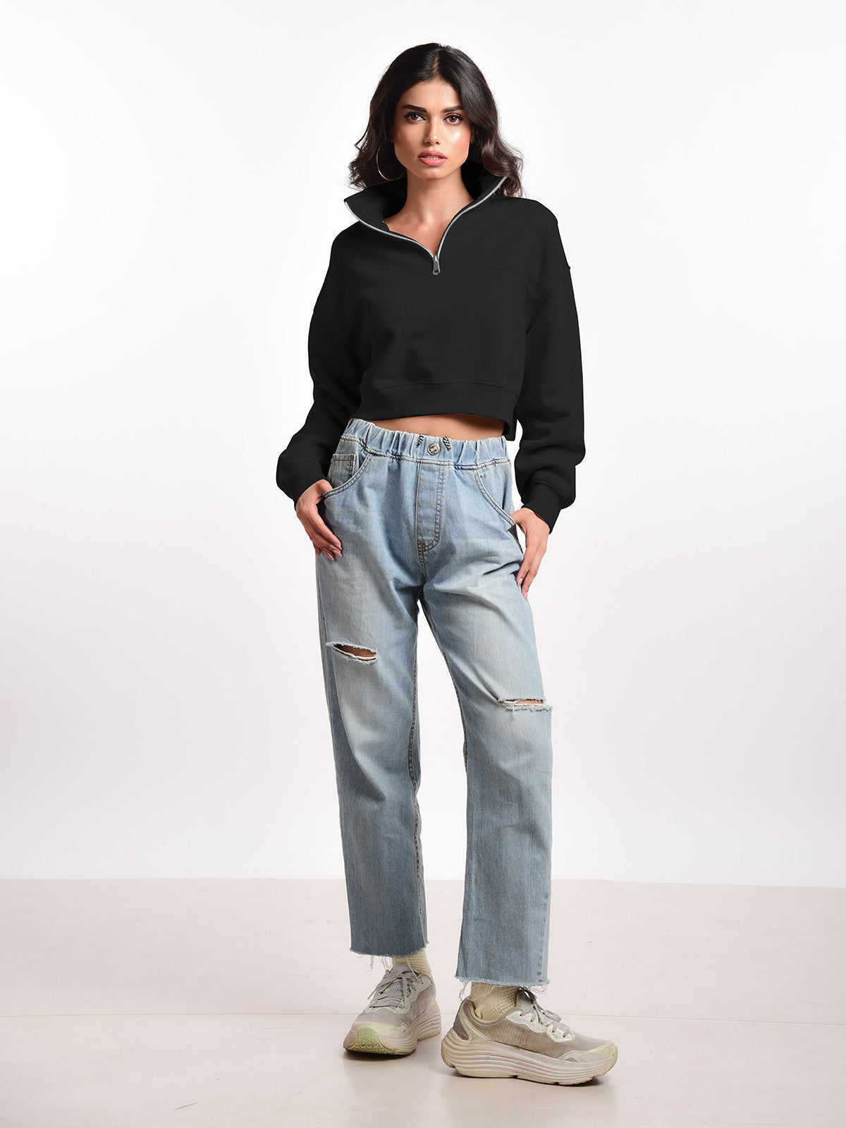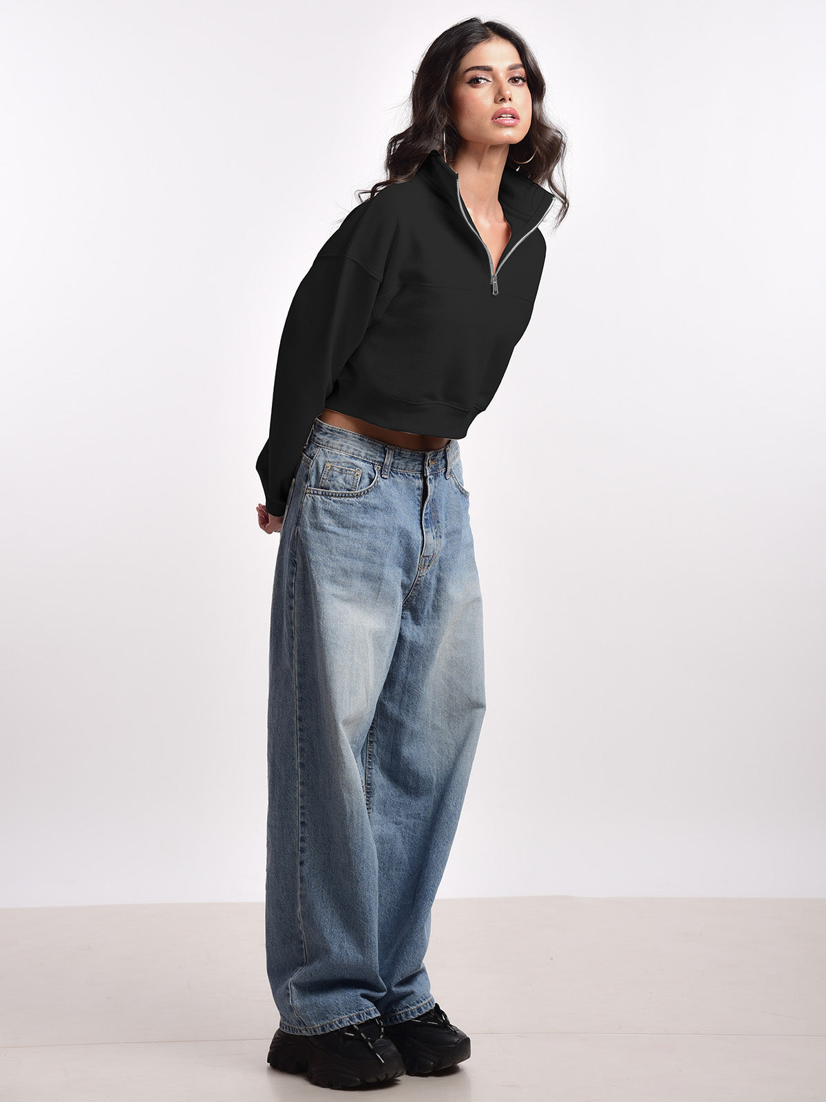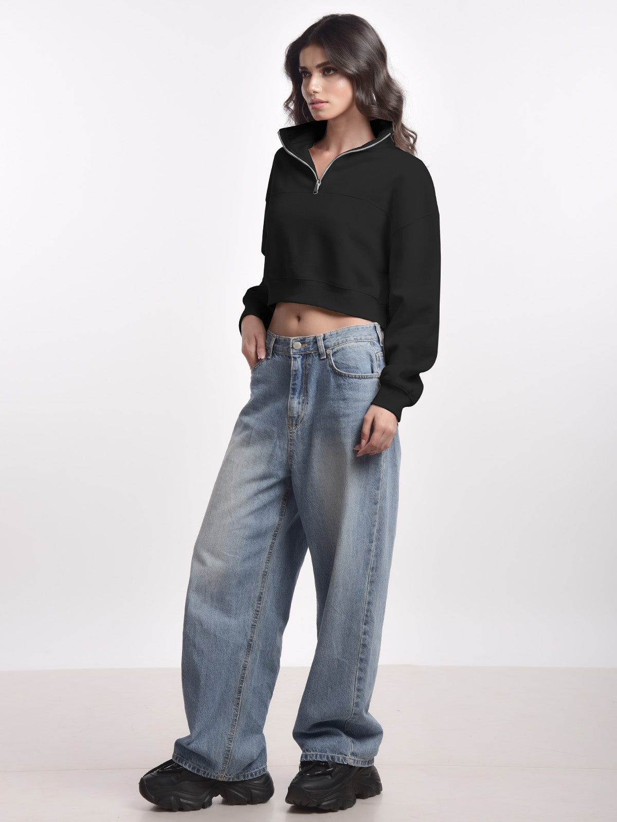 Femmora Premium 100% Cotton Fleece Long Sleeve Solid Henley Crop Length Sweatshirt for Women | Knitted Pullover | Loose Fit | Front Zip | Dropped Shoulder – Casual Winter Wear – Black(Pack of 1)